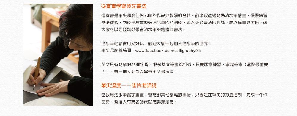 「當我用沾水筆寫字畫畫,會忘卻其他繁雜的事情,只專注在筆尖的力道控制,完成一件作品時,會讓人有莫名的成就感與滿足感。」擁有近10萬粉絲的佳伶老師,於2016年夏天出版《筆尖溫度》,是一名英文書法與沾水筆繪畫教師,喜愛在網路分享書寫與創作。