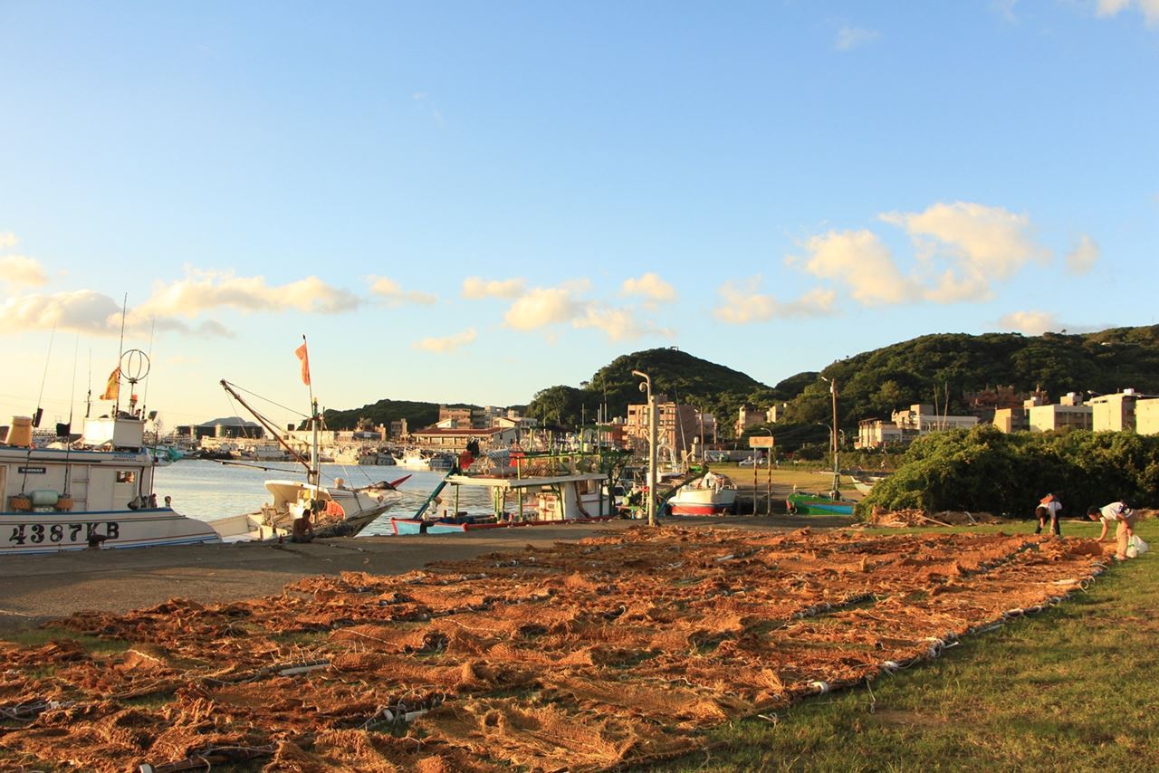 基隆八斗子漁港為全台灣最大的飛魚卵卸貨點,漁港前遍地的飛魚卵草包,在陽光灑落下金光閃閃。