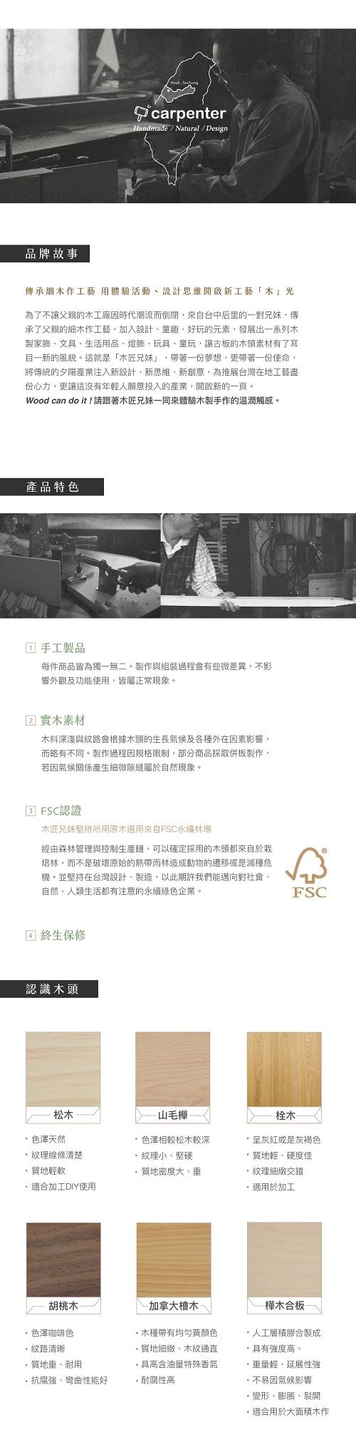 親手製作屬於自己的木製家居品,讓自己設計花樣,細心拼組,汗水融合設計的心血,伴隨木香氣蔓延,完全能感受到木作是件多麼令人抒壓的開心事!木工作品講究細膩的手工與質感,自己親手完成的作品,更能了解木匠師傅製作每一件作品的用心和耐心☺