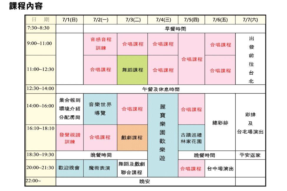 每人18,000元【全程7/1~7/7營隊住宿】含:全程講師費、餐費、麗寶樂園及林家花園門票及活動費、結業證書、台中場及台北場票券各2張、台中台北來回車資、成果演出DVD、譜費、保險、紀念T恤、閉幕酒會。