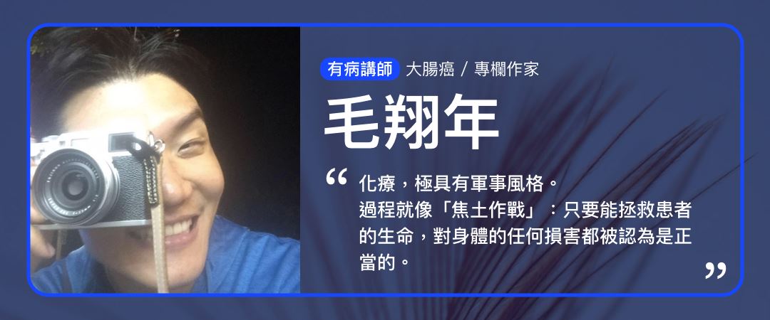我是小毛,化療後痘痘滿臉爆只能一直戴口罩,自封台北歌劇魅影男主角。在2017年5月確診大腸癌第三期,至今仍和化療穩定交往中。 生病後,對週遭事物非常敏感,喜歡觀察醫護人員、同房病友、癌友、自己。