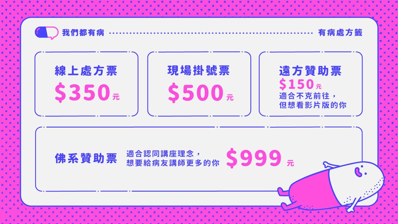 共5位——適合給認同該講座理念,而且想要給病友講師更多支持的你。此票卷包含入場資格和影片檔案連結。扣除基本人事場地成本後,活動總收益都將歸病友講師,你的佛心將確實傳遞到病友身上。