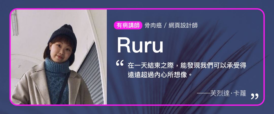 我是 Ruru。大二時,參加女人迷實習計畫因此找到了人生的志趣,卻忽然被確診罹患骨肉癌,夢想因此被強迫按下了暫停鍵。休養的這一整年,我假裝快樂,實則自卑又墮落。