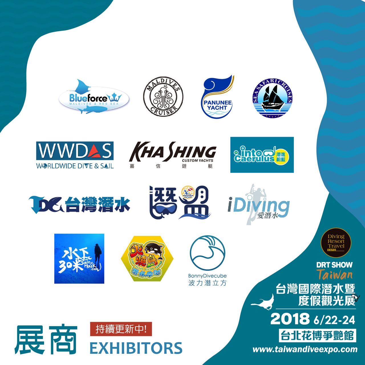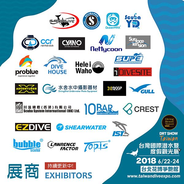 DRT SHOW (Diving, Resort and Travel EXPO/台灣國際潛水暨度假觀光展)為台灣唯一專業潛水展,除了是潛水愛好者必訪盛會,也歡迎所有對潛水旅遊有興趣之民眾參觀!現場除了可以找到酷炫潛水裝備、優質潛水教學中心、國內外潛水度假村與船宿,亦有海洋文創市集、水下攝影藝廊、海洋保育闖關遊戲、多達30場的精彩潛水相關講座以及現場幸運大抽獎。不論你是否愛潛水,如果你愛海洋,請你/妳務必一起來參與這場盛會!!