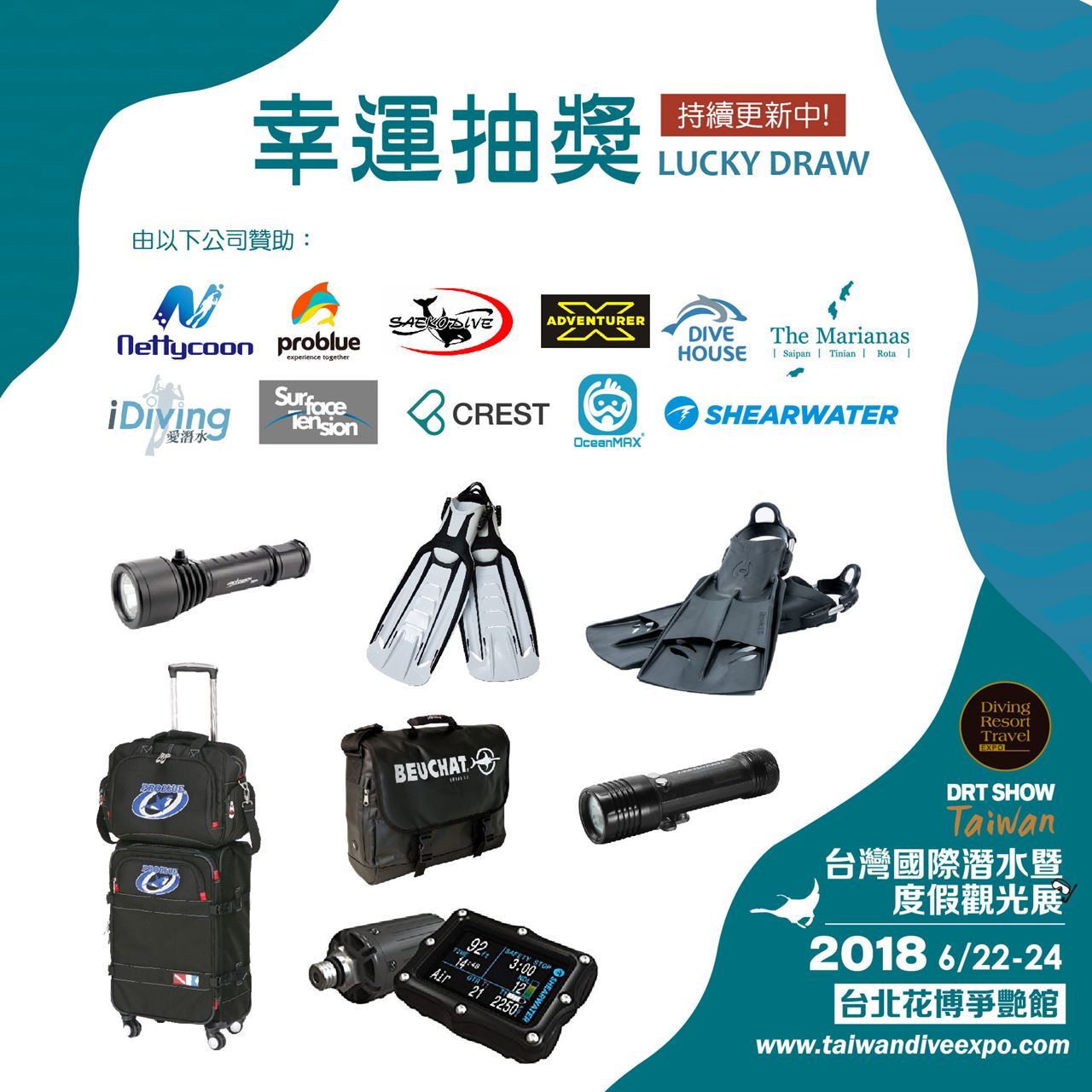 幸運抽獎活動更是不能錯過阿~獎品有:Problue 旅行托輪袋三件組、X-ADVENTURER攝影燈、CREST最新款調節器、SHEARWATER潛水電腦表、OceanMax潛水三寶(面鏡、蛙鞋、呼吸管)、BEUCHAT防水包、HOLLIS蛙鞋、OCEANIC蛙鞋、ORCATORCH潛水燈、SAEKODIVE蛙鞋、SSI自由潛水平靜水域潛水員課程抵用券、SSI進階探索潛水員免費課程、Saipan 塞班島PIC渡假村雙人住宿券、Bestdive潛水衣......等等。