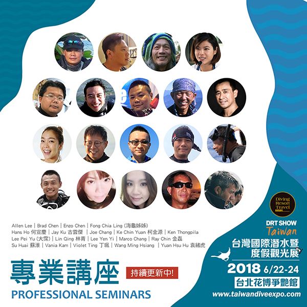 與大師面對面,聽他們分享有關水下攝影、自由潛水、技術潛水、美麗潛點、海洋保育與生態,還有最新潛水裝備介紹等等,主題豐富,講者持續新增中,一定讓你看好看滿: