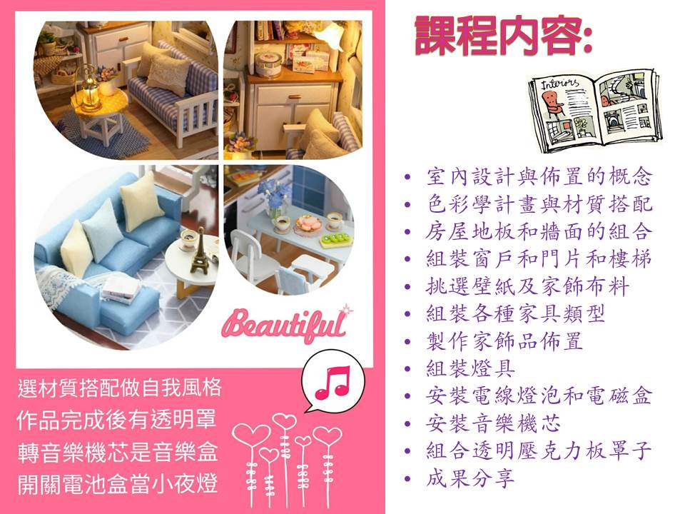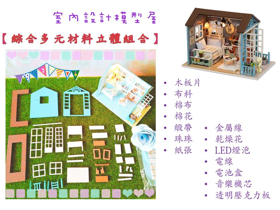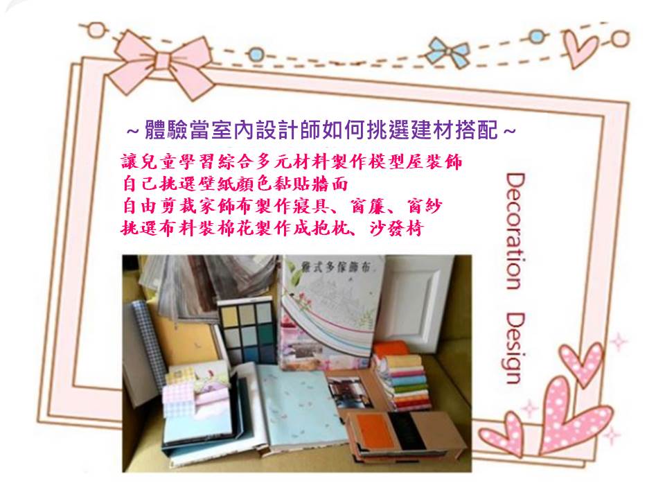 讓小朋友提升美學力與空間感,學習挑選材質搭配與佈置的樂趣,體驗自己動手做出立體家具及組合房屋模型的成就感。