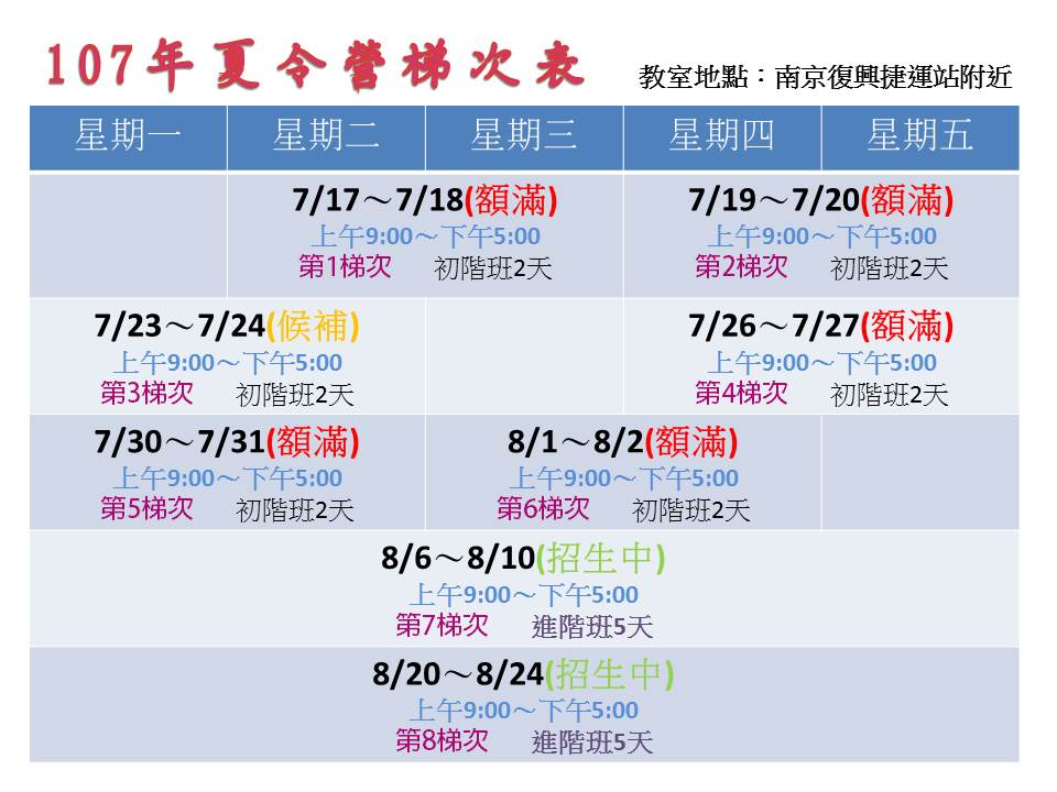 此購票系統的上課日期為【進階班8/20~8/24】,名額有限