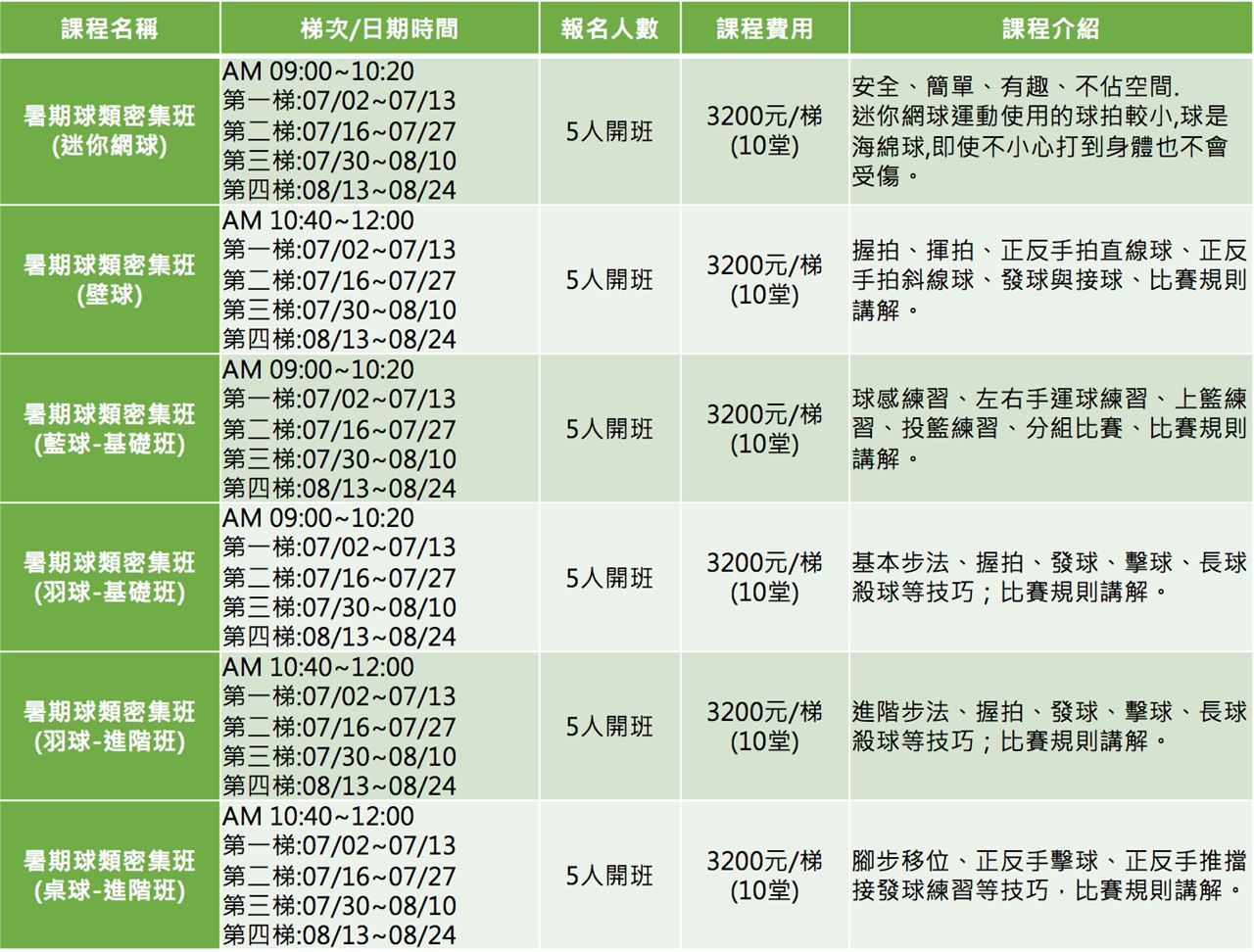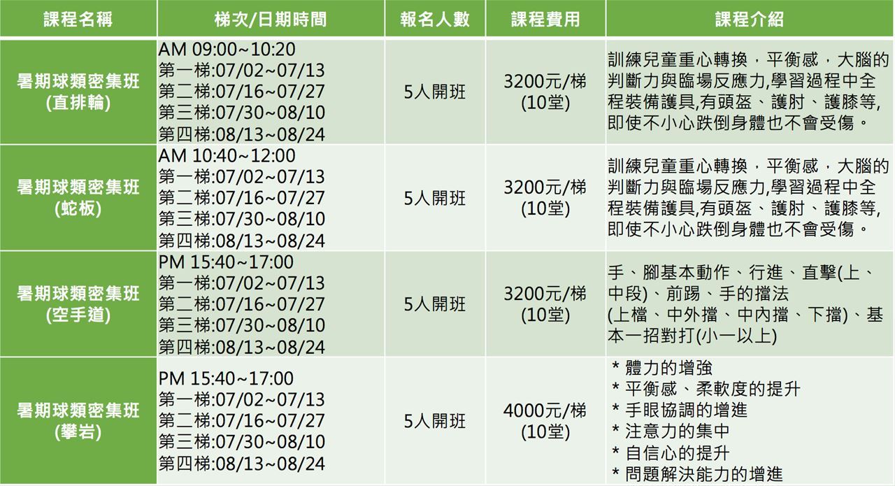 球類課程優惠:報名2梯/6200元、報名3梯/9100元、報名4梯/12000元。