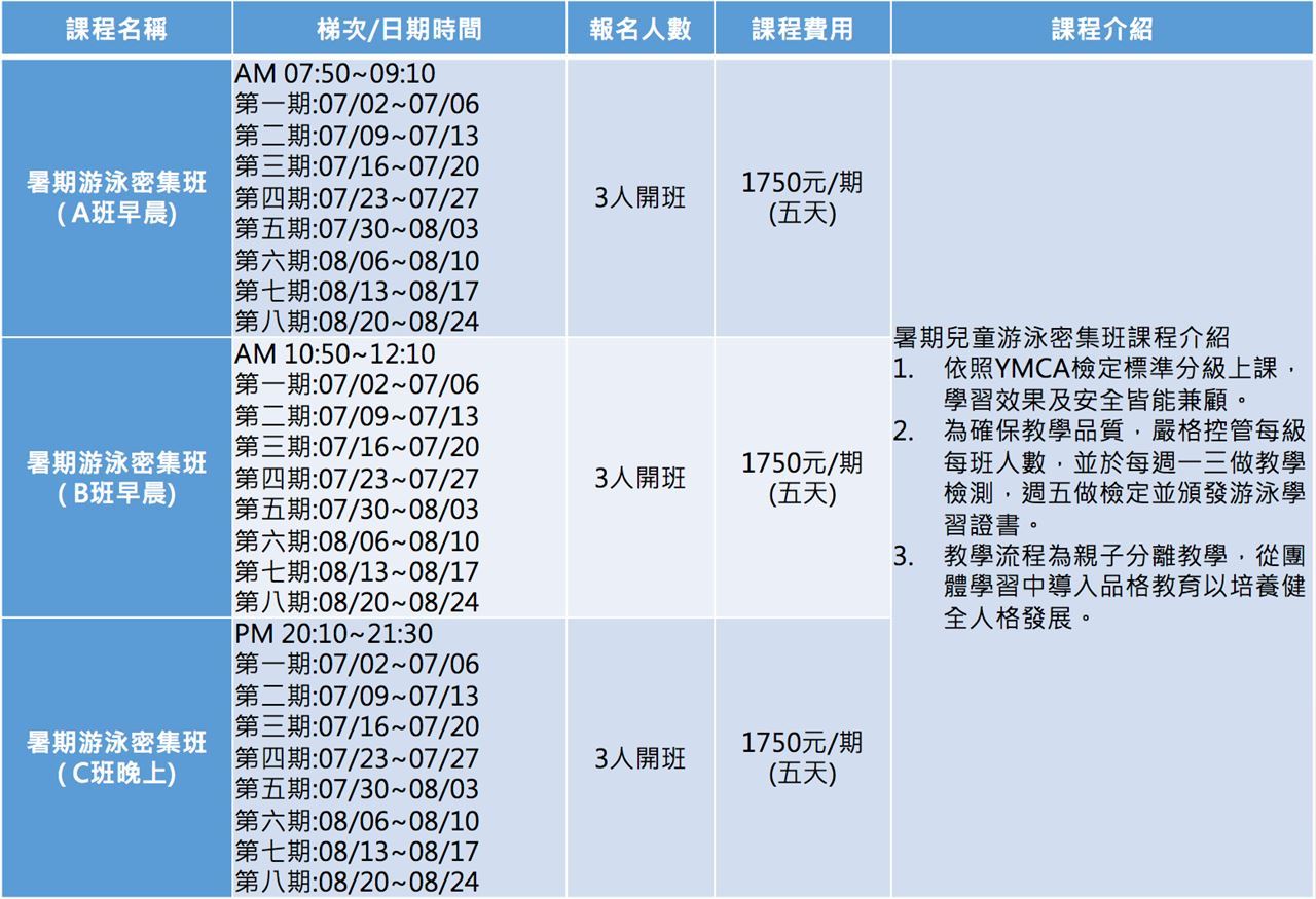 *課程優惠:一次報名三期打9折,一次報名五期以上打8折,另外再贈送8/27水中兒童安全教育活動課程。