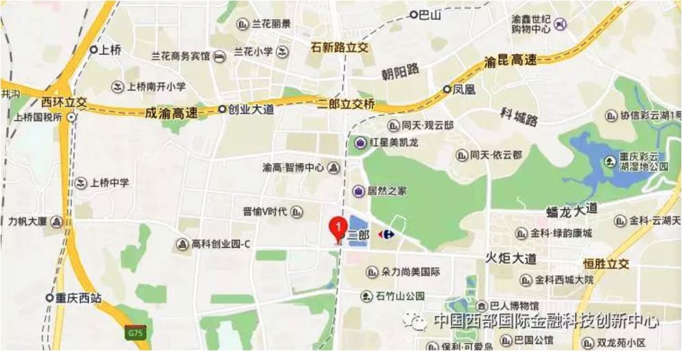 中國西部國際金融科技創新中心位於九龍坡區二郎迎賓大道與火炬大道交匯處,九龍坡高新區二郎火炬大道69號啟迪科技園3幢,西鄰重慶留學生創業園,東鄰重慶軌道交通5號線。