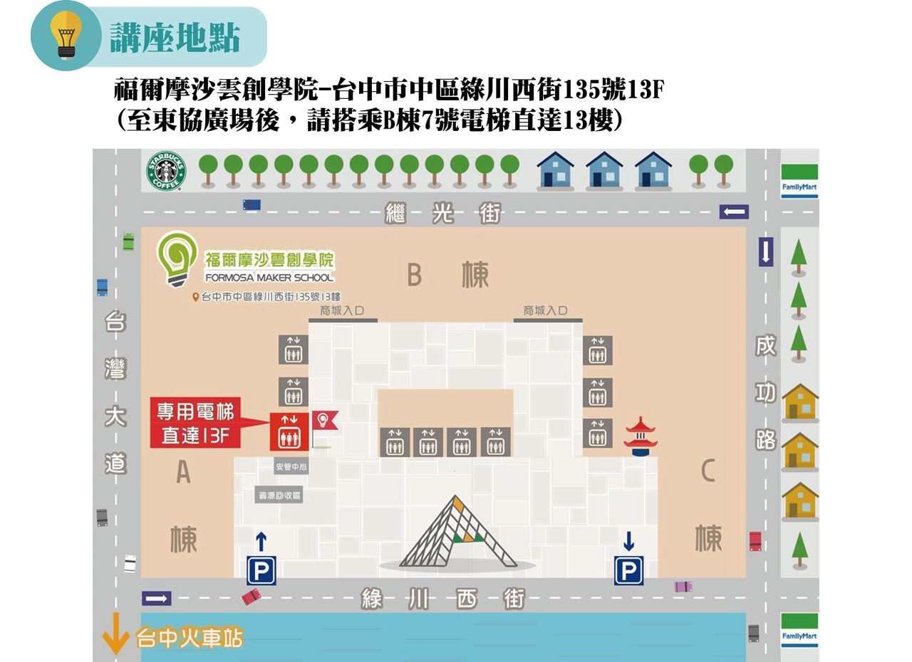 福爾摩沙雲創學院-請搭乘B棟7號電梯直達13樓
