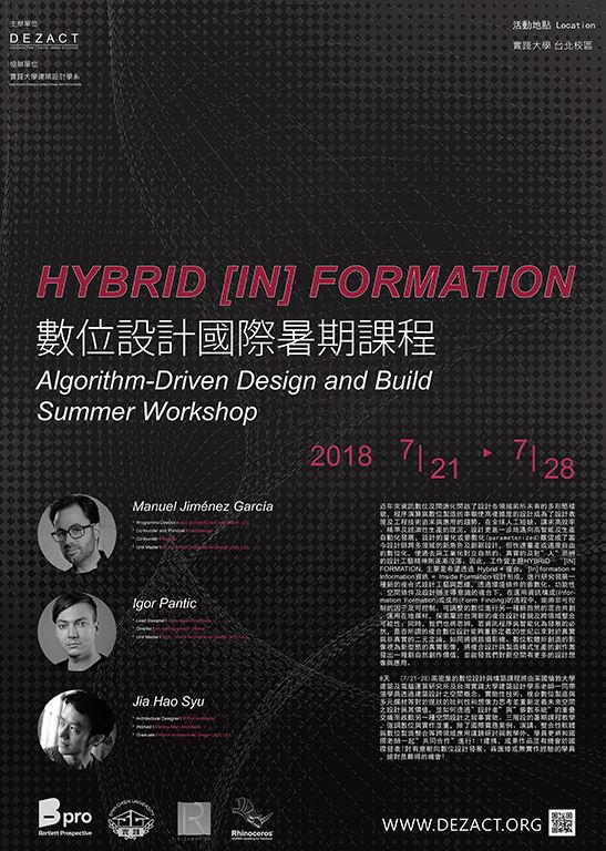 HYBRID[IN]FORMATION 將是一個為期8天結合前衛數位設計和未來空間研究的國際性工作營,內容將透過結合實驗性數位設計方法、複合媒材應用、製造程序與相關應用技術以 ”資訊複合構成”為架構,去探索當今設計如何在講求設計表現、創新空間感的同時,能超越僅求精準、可被製造所導致設計非常工業化的處境,複合一詞為此工作營的主軸,將由主導團隊英國的DEZACT,及台灣的協辦單位實踐大學建築設計學系與各領域參與學員一同探索程序化設計的複合未來空間創作及探索資訊演算法(algorithm)與複合媒材(composite material)整合之跨領域應用議題。活動內容除了設計實作課程外,包含國際系列講座,邀請英國、西班牙、台灣等地之建築師、設計師和學者進行對談及數位軟體整合課程 – 此課程指導老師為普立茲克獎得主Zaha Hadid事務所主導設計師,將親自帶領學員一同體驗最先進的數位設計流程。