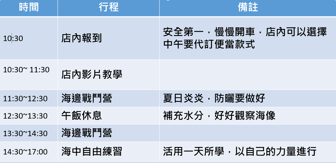 4. 不會游泳請自行斟酌是否則適應海水,教練也會以淺水區域為主
