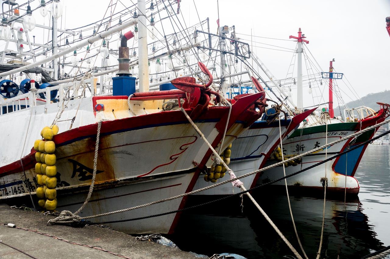 傳統舢舨漁船停靠在八斗子沙灘,「海腳」經歷了一晚的努力,正把四破魚、小卷、丁香魚、花飛等漁獲緩緩卸下,並準備送往一旁的魚寮加工,炊煙裊裊的凌晨,熙來人往,最後划著小船沿著基隆北海岸送到崁仔頂的魚行來販賣。
