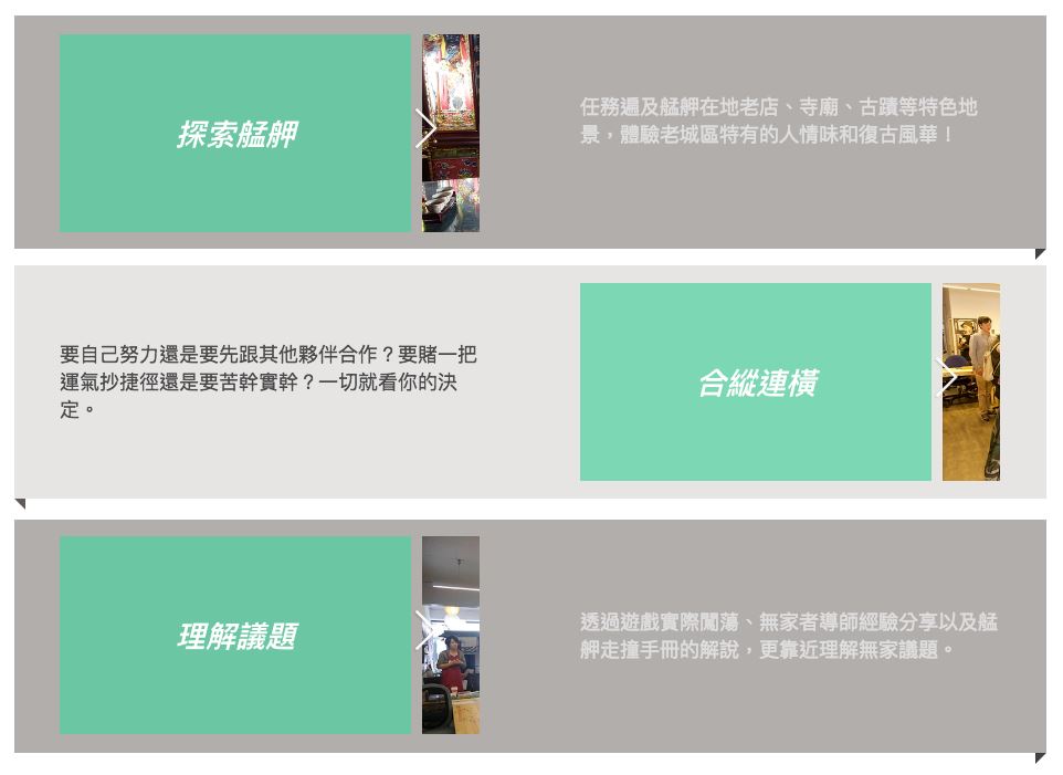 也許你聽過真人圖書館、參加過街遊導覽,而總是聽著無家者們說,還是有哪裡不夠。於是我們耗費近一年的時間,企劃出「艋舺走撞」街頭遊戲,讓玩家親自扮演無家者與社工,以解謎方式探索萬華,並在過程中更深入了解貧窮中的每個選擇,有多麼不容易。