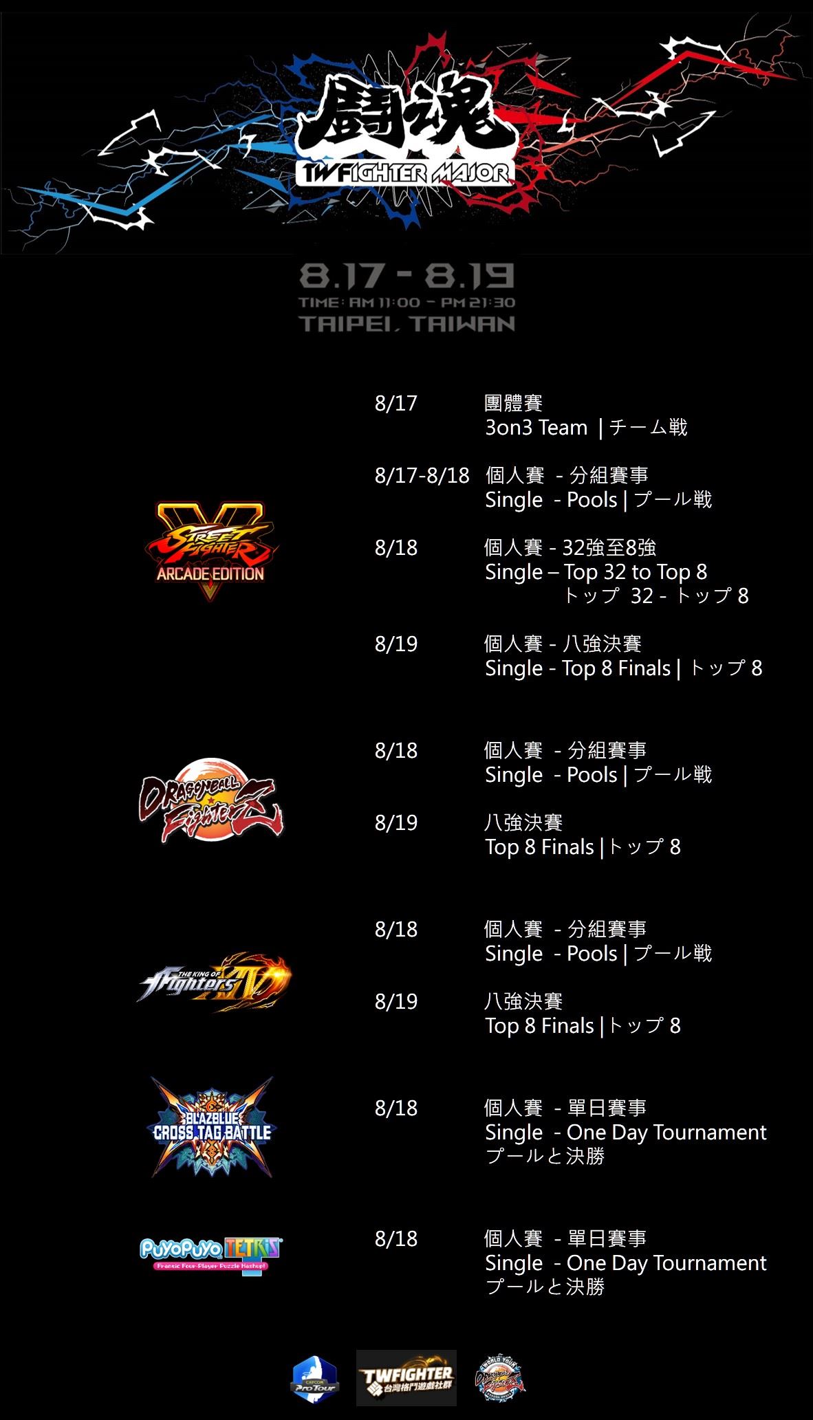 - 賽程表將於8月15日18:00pm於活動官網(www.twfmajor.com) 及 TWFighter Facebook粉絲專頁 (www.facebook.com/TWFighter) 公佈