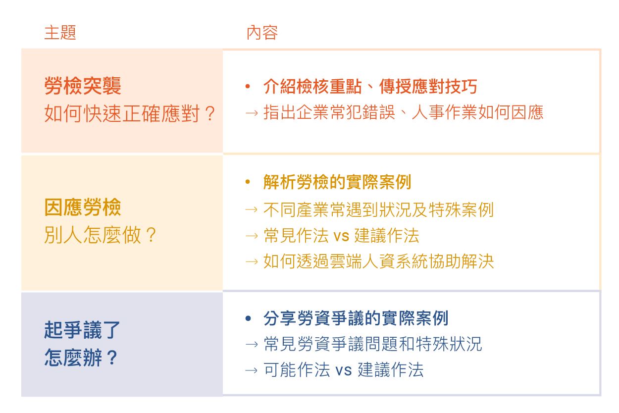 三、專家解惑:現場提供專業顧問諮詢,解答您對勞檢實務、勞資爭議或人資系統的疑問。