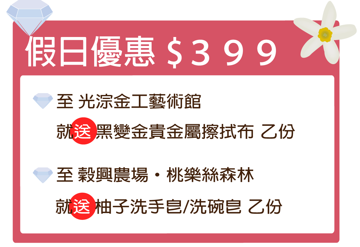 來 光淙金工藝術館,即贈【黑變金貴金屬專用飾銀布】乙份,市價$120元。