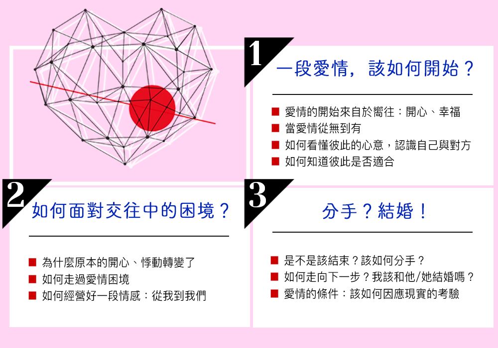 不管處於愛情中的哪個階段,我們都渴望愛人,也渴望被愛;總想有個「相互了解」、並願意「參與彼此」生命的人。其實我們不是不愛了,但真正的困難是,我們總以為愛是自然而然就會的,直到在愛情裡跌跌撞撞,才發現原來我們不懂愛,原來愛需要學習。我們總從最後一根稻草開始想:到底哪裡出錯了?但或許更根本的作法,是先認識自我,認識自己是什麼、要什麼、適合什麼樣的對象。