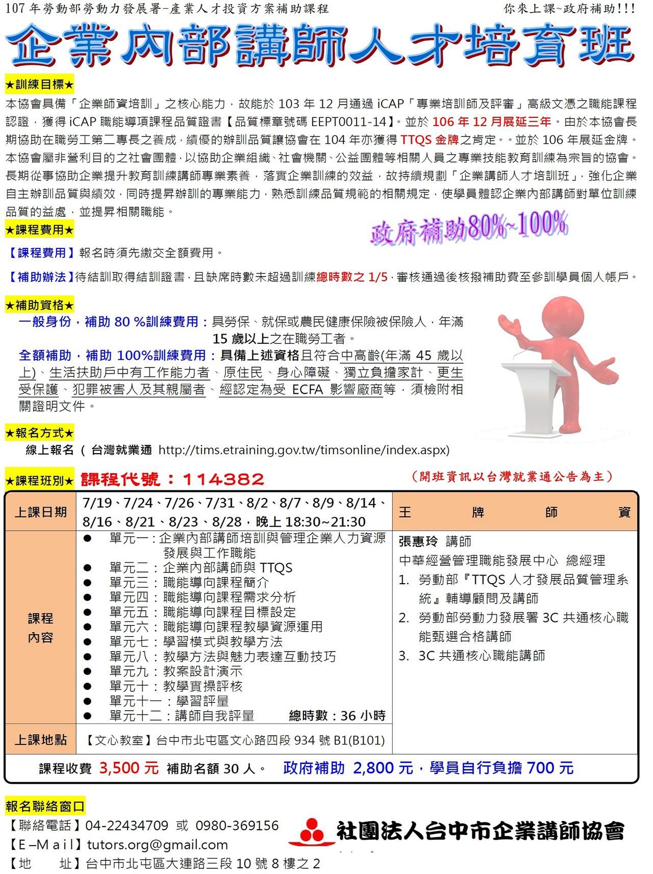 產投-政府補助課程『台中-企業內部講師人才培育班』,此梯次開放30位,補助名額。僅此一班,錯過很可惜喔!有興趣參加課程者,請先確認是否有開通email帳號及密碼喔!