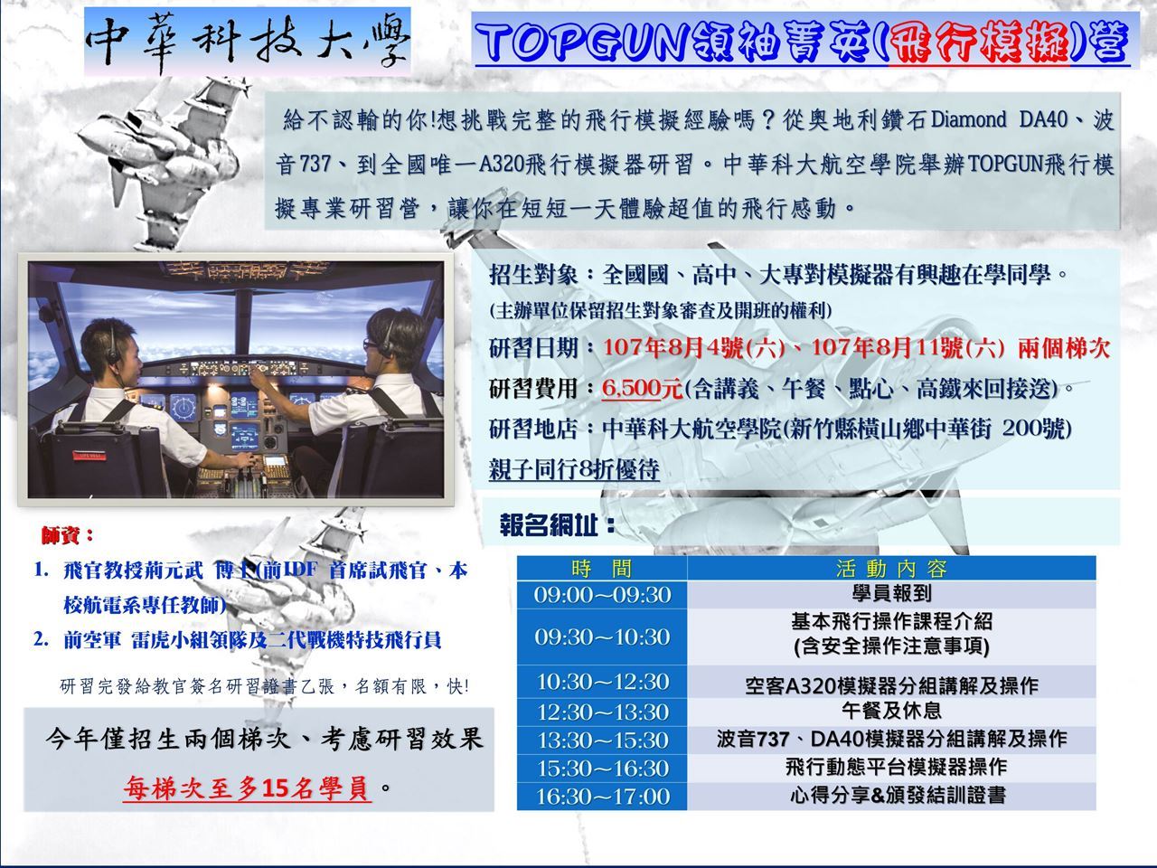 給不認輸的你!想挑戰完整的飛行模擬經驗嗎?從奧地利鑽石Diamond DA40、波音737、到全國唯一A320飛行模擬器研習。中華科大航空學院舉辦TOPGUN飛行模擬專業研習營,讓你在短短一天體驗超值的飛行感動。