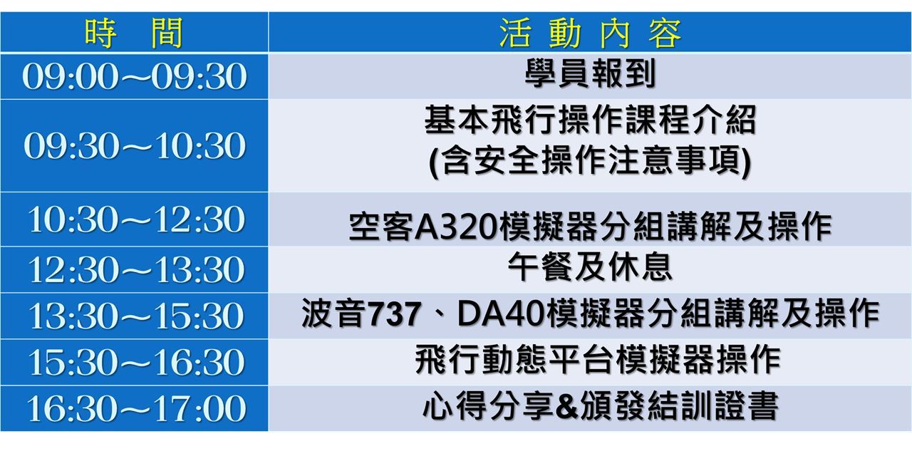 1.基本飛行操作:使用航空學院的航空模擬教室,由教官解說飛行操作概念,每人一套操作航空專業飛行搖桿及踏板。