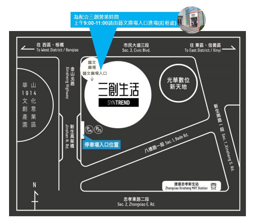 ★ 特別說明:請注意,為配合三創商場營運時間規定,9:00-11:00之時段,商場將只開放藝文廣場入口(位於市民大道三段/金山北路口)供持票者進場,其他入口皆為關閉。