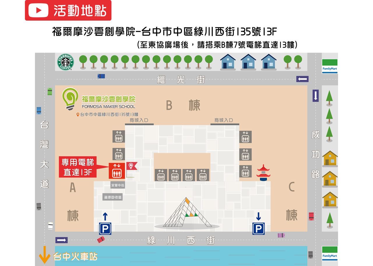 福爾摩沙雲創學院-至東協廣場後,請搭乘B棟7號電梯直達13樓
