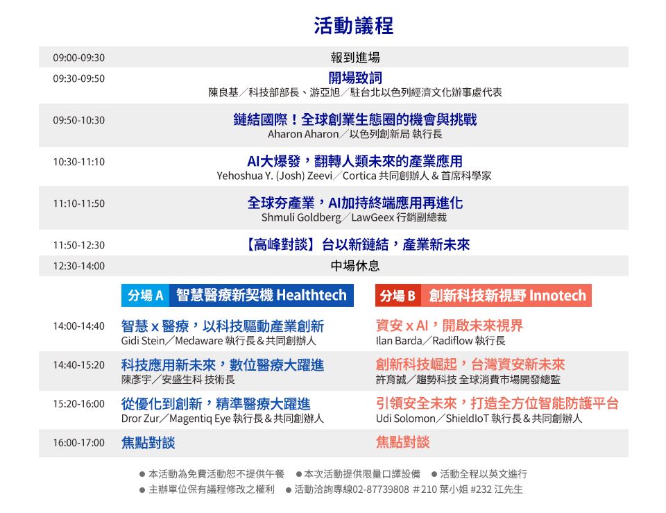 2018年科技部舉辦第二屆「台以創新論壇」,邀請台灣與以色列兩國產、官、學界的專家及企業代表,聚焦「人工智慧」、「智慧醫療」與「資訊安全」三大議題進行專題演講與深度對談,共同激盪出台灣與以色列的合作火花,並打造科研合作的交流平台,提升台灣產業創新能量。