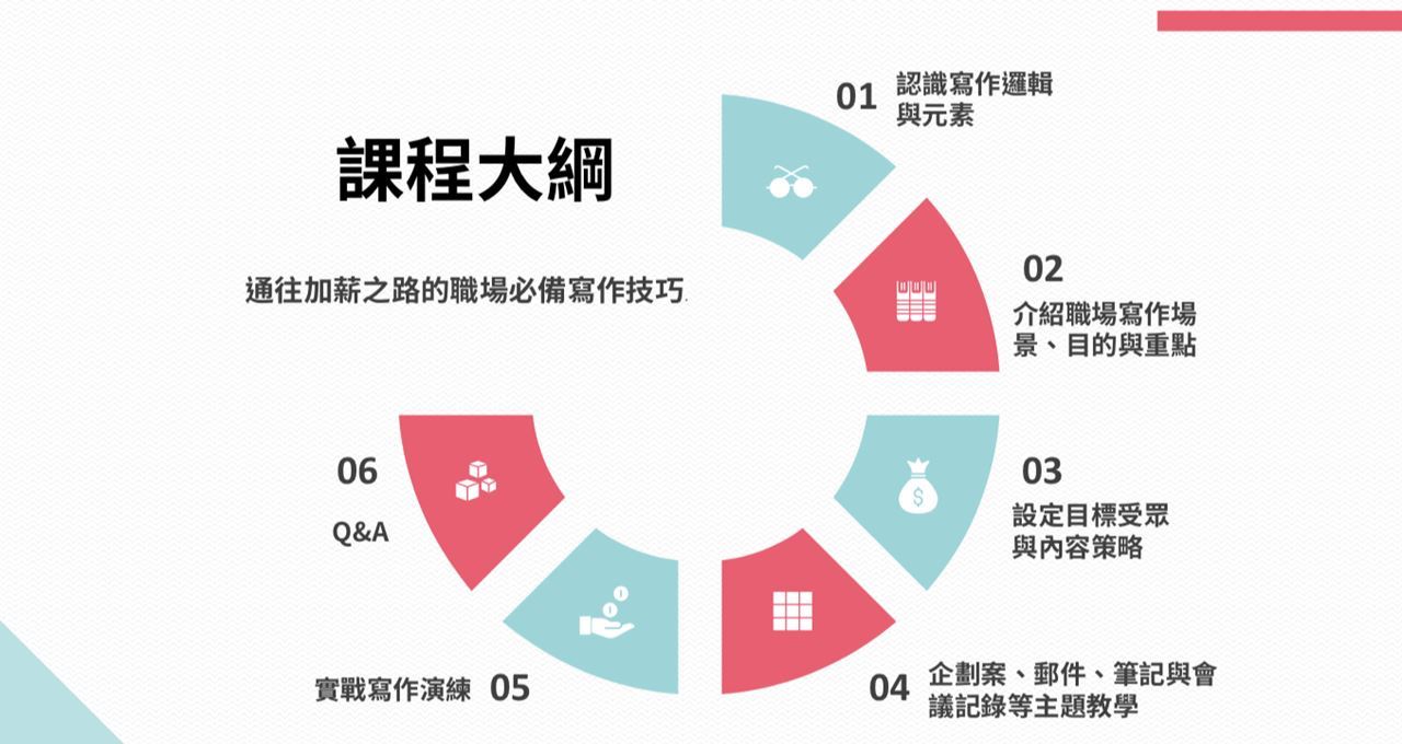 | 4.企劃報告、郵件、筆記與會議記錄等主題教學 | a.企劃報告該怎麼寫才能說服主管? b.電子郵件該怎麼寫才能打動客戶? c.心得筆記該怎麼寫才能內化成長? d.會議記錄該怎麼寫才能掌握重點? |