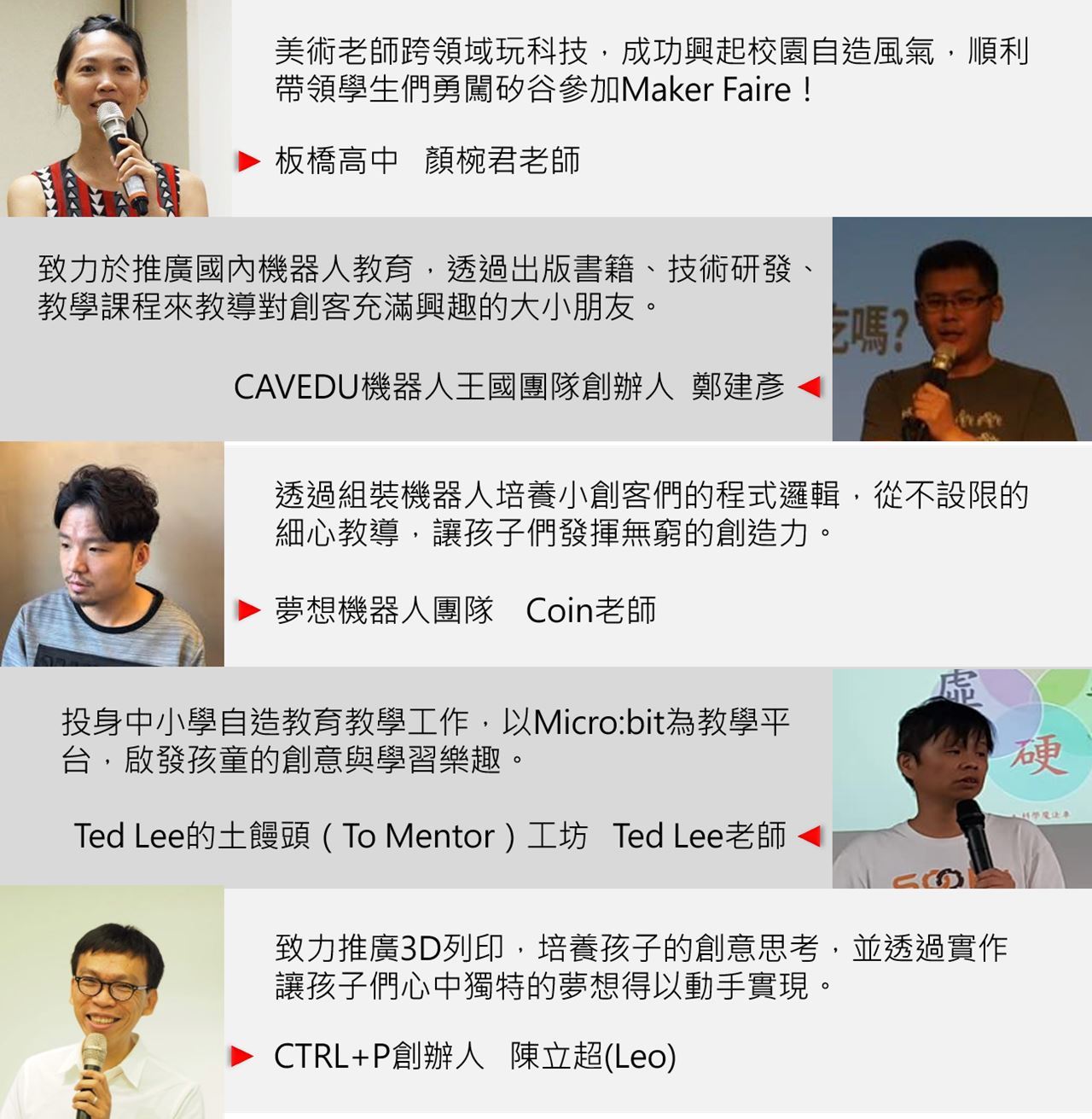 本次座談會邀請到積極投入台灣創客教育的推手們,從他們的經歷述說創客教育的現況。