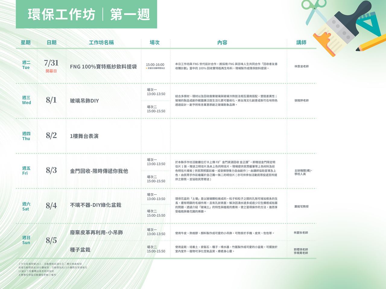 近50場工作坊:透過回收材質再生創作,讓廢棄物重生。一同將環保落實於生活中。