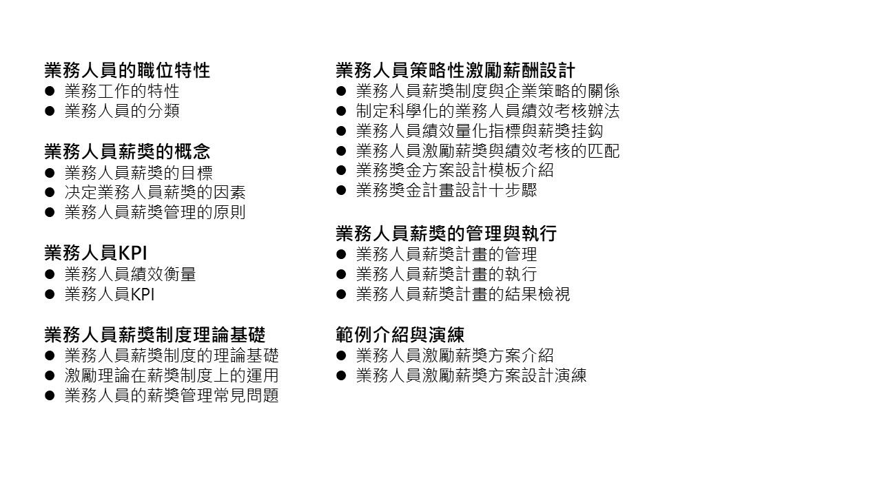 本課程透過範例介紹及方案設計演練以強化學員對業務獎金方案的制定能力。