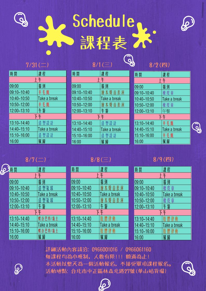 課程內容包含:羊毛氈教學、環保造型設計、繪本導讀及聲音表演、橡皮圖章製作、造型氣球、黏土教學、肢體律動