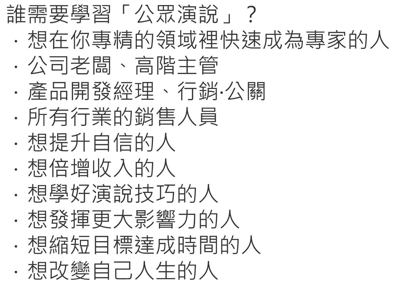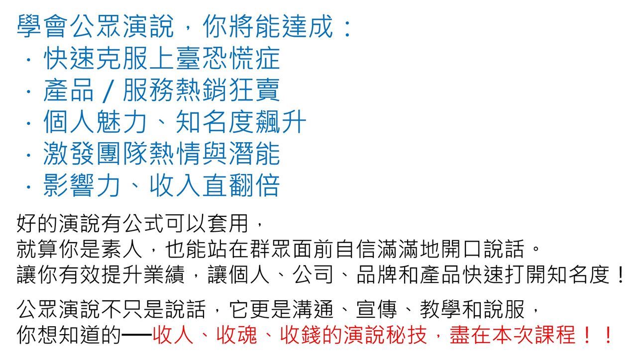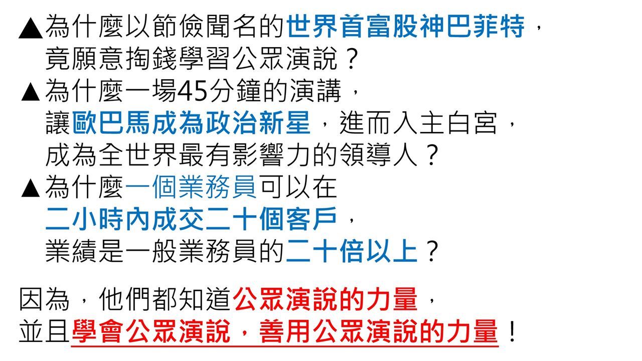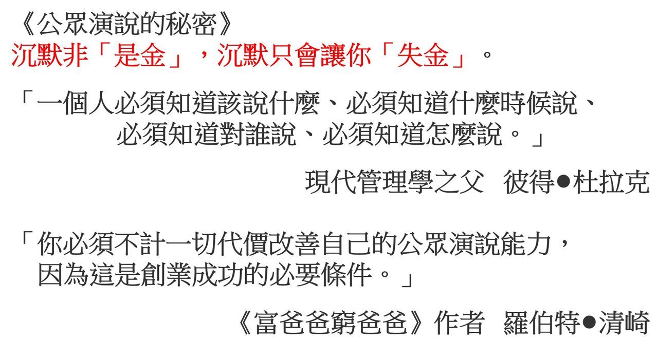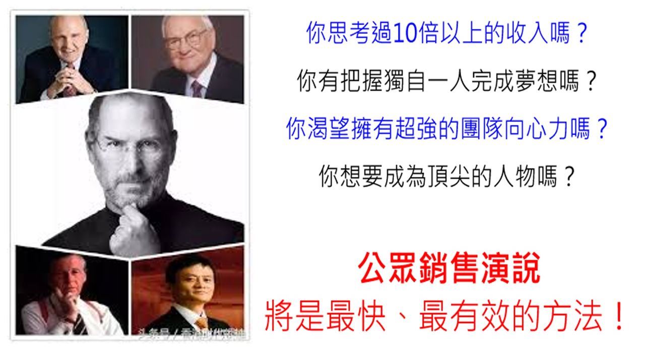 本次活動主辦單位:翻身俱樂部協辦單位-招集人:創富合作社 僅此一次,錯過不再2018公眾演說力開班囉!趕緊報名了解詳情~參加就有機會獲得大禮包➤➤➤點我報名「阿里巴巴」是馬雲和他的團隊13個人,擠在三套小房間裏創建出來的,為什麼這13個人願意不顧一切的跟著馬雲?靠的就是馬雲的敢想、敢說!馬雲說:我的人生是我說出來的!本課程免費僅須負擔場地費:100元