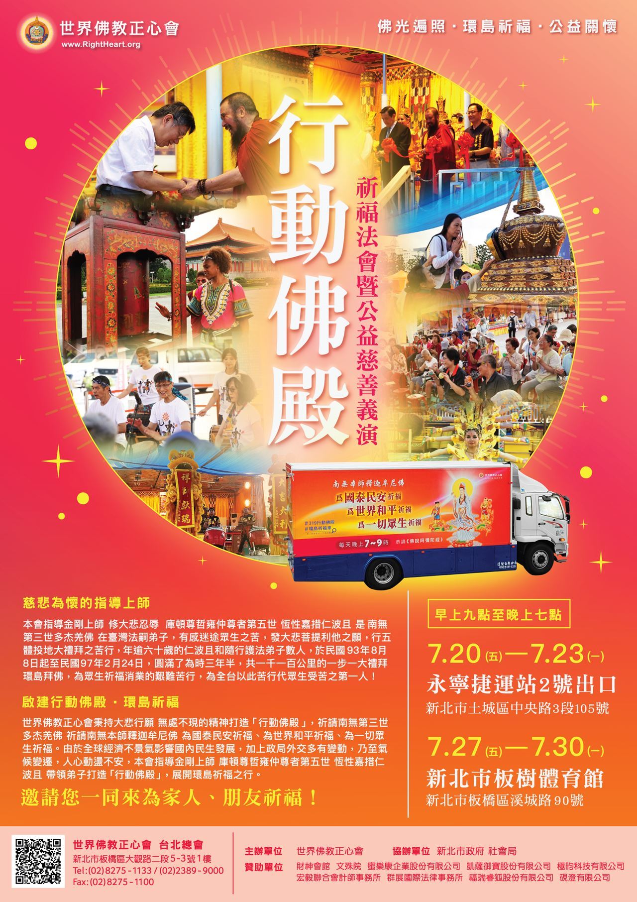 由於全球經濟不景氣影響國內民生發展,加上政局外交多有變動,乃至氣候變遷,人心動盪不安,本會指導金剛上師 庫頓尊哲雍仲尊者第五世 恆性嘉措仁波且帶領弟子打造「行動佛殿」,展開環島祈福之行。行動佛殿第五站-新北市土城永寧捷運站2號出口,即將在7月20日到7月23日盛大舉辦