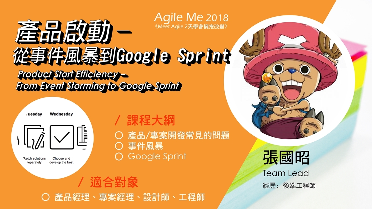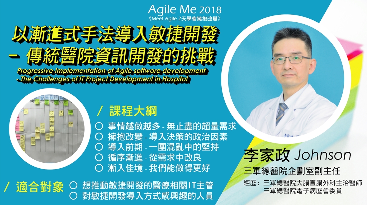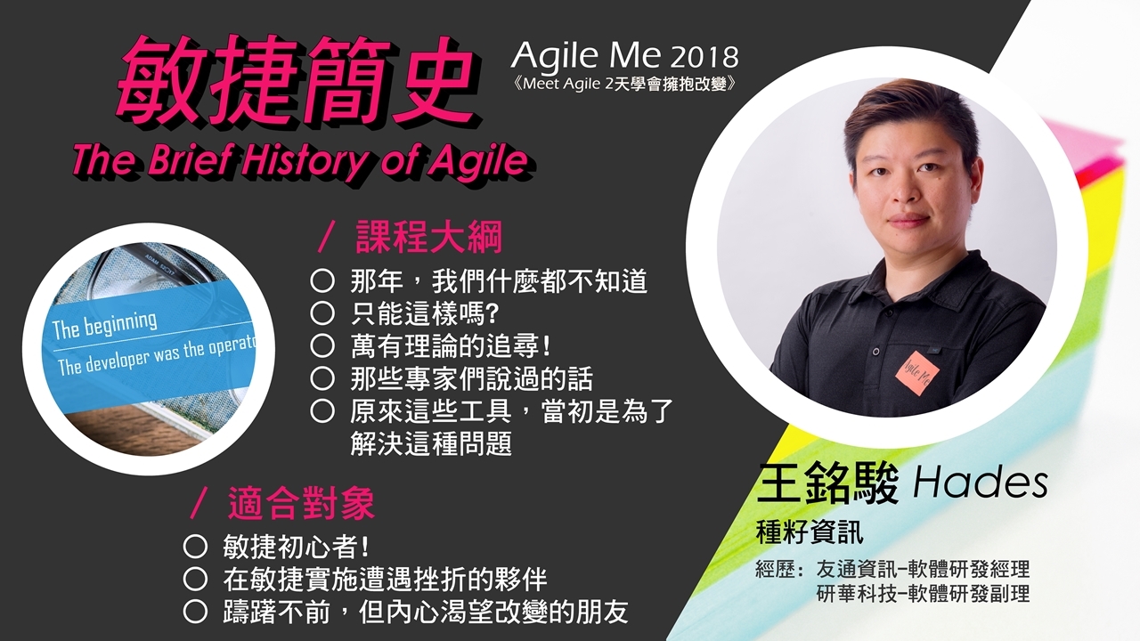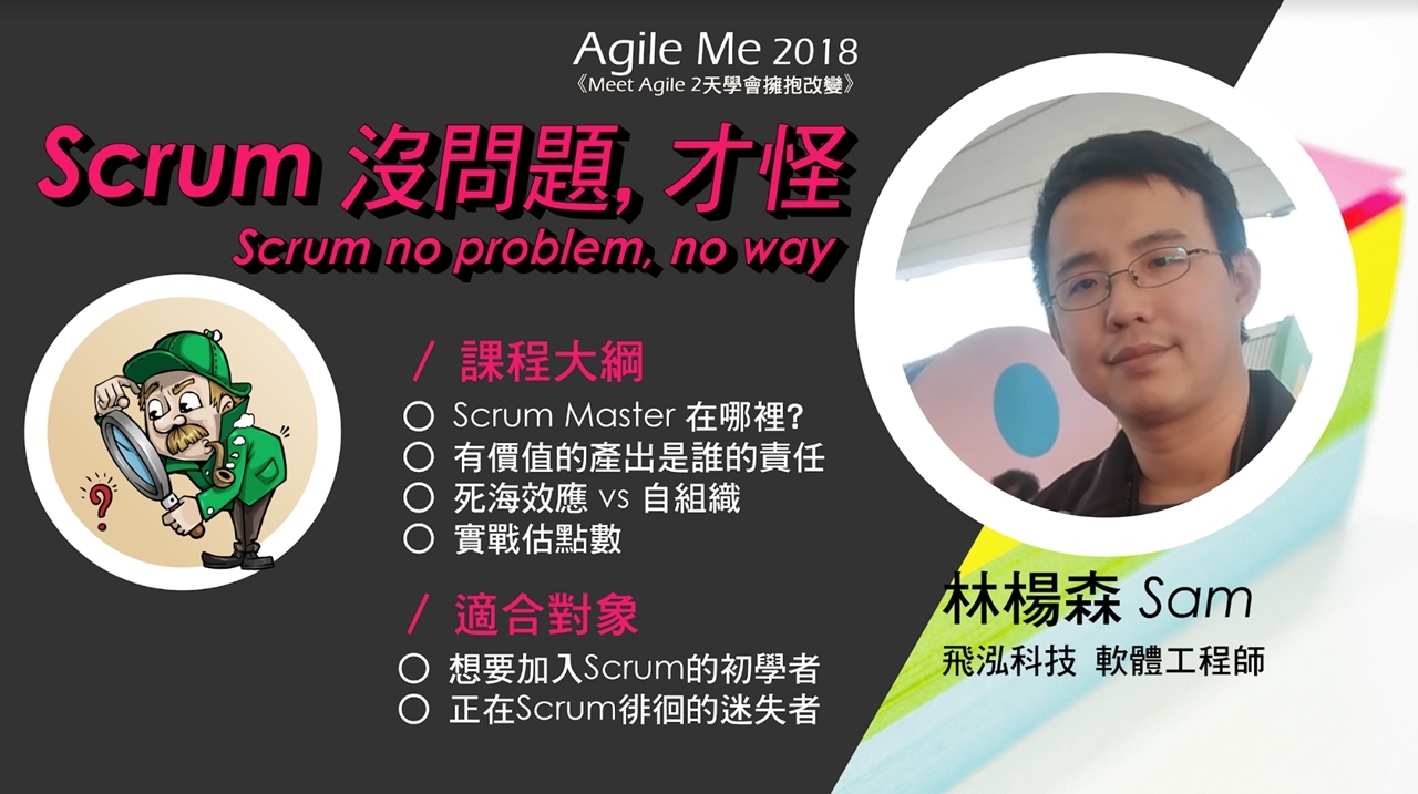 除了 Scrum.org 的 2場演說及 1場工作坊外,敏捷專家學會,特地為敏捷涉入程度不同的與會佳賓們,量身打造了多樣化的議程,本次議程共分三軌, 有專為新手們開張的「敏捷新訓營」;已接觸敏捷一段時間的您,「敏捷聚寶盆」等待各位來練功;敏捷老手們,「敏捷最前線」歡迎各位來取暖;至於對敏捷懷抱熱情的您,讓我們一起來「敏捷追星」吧!