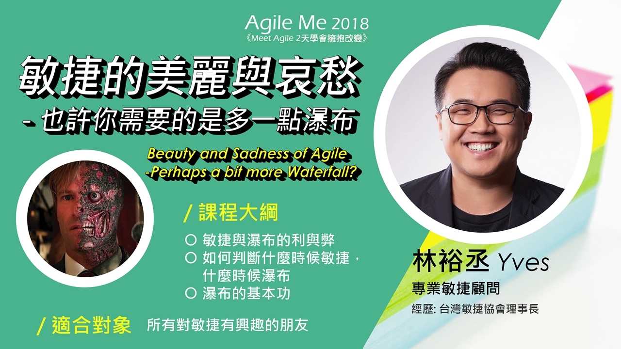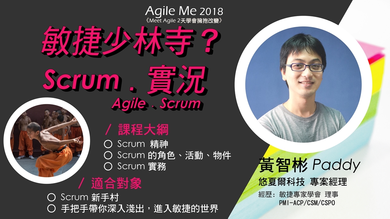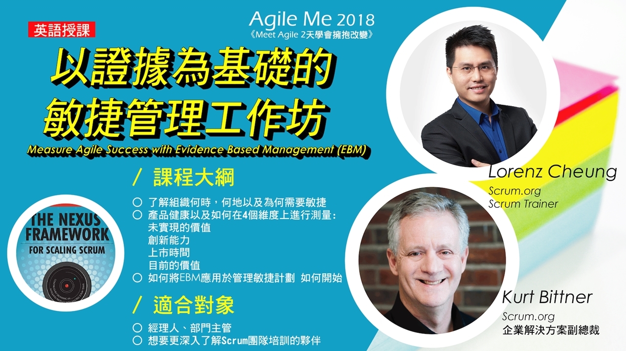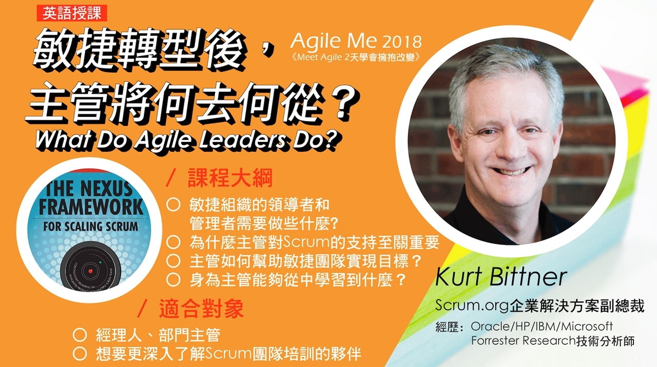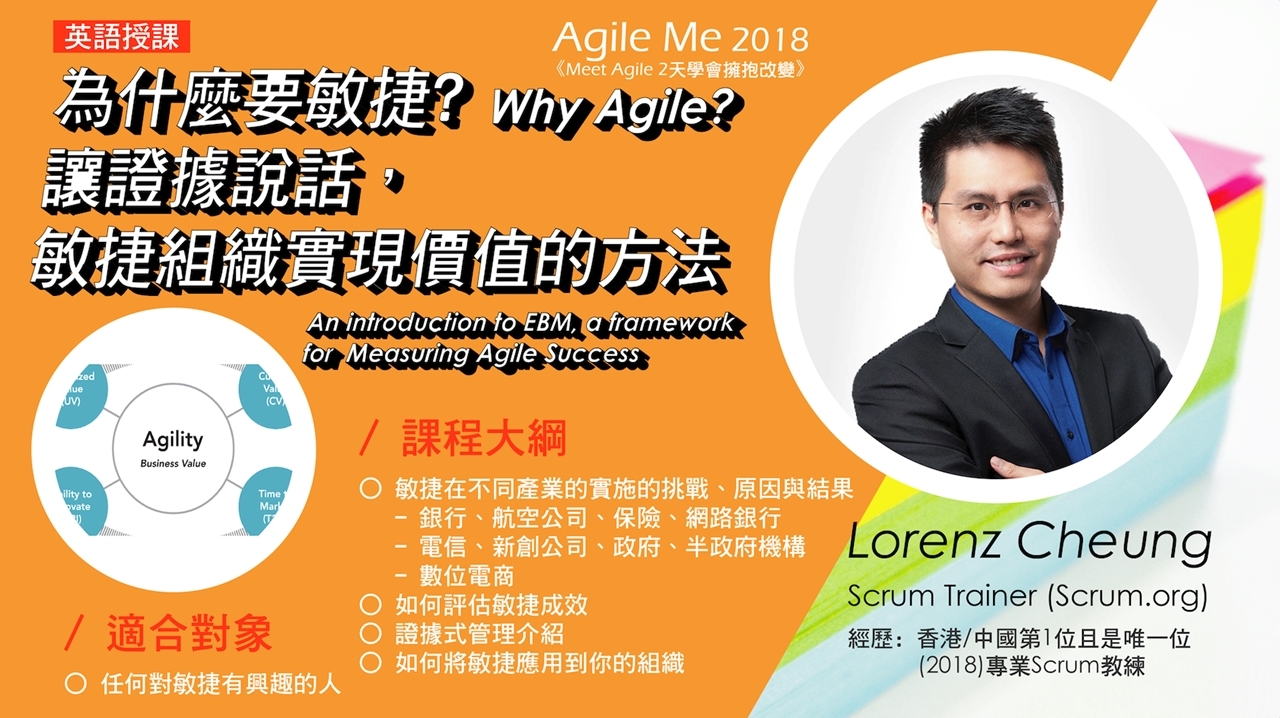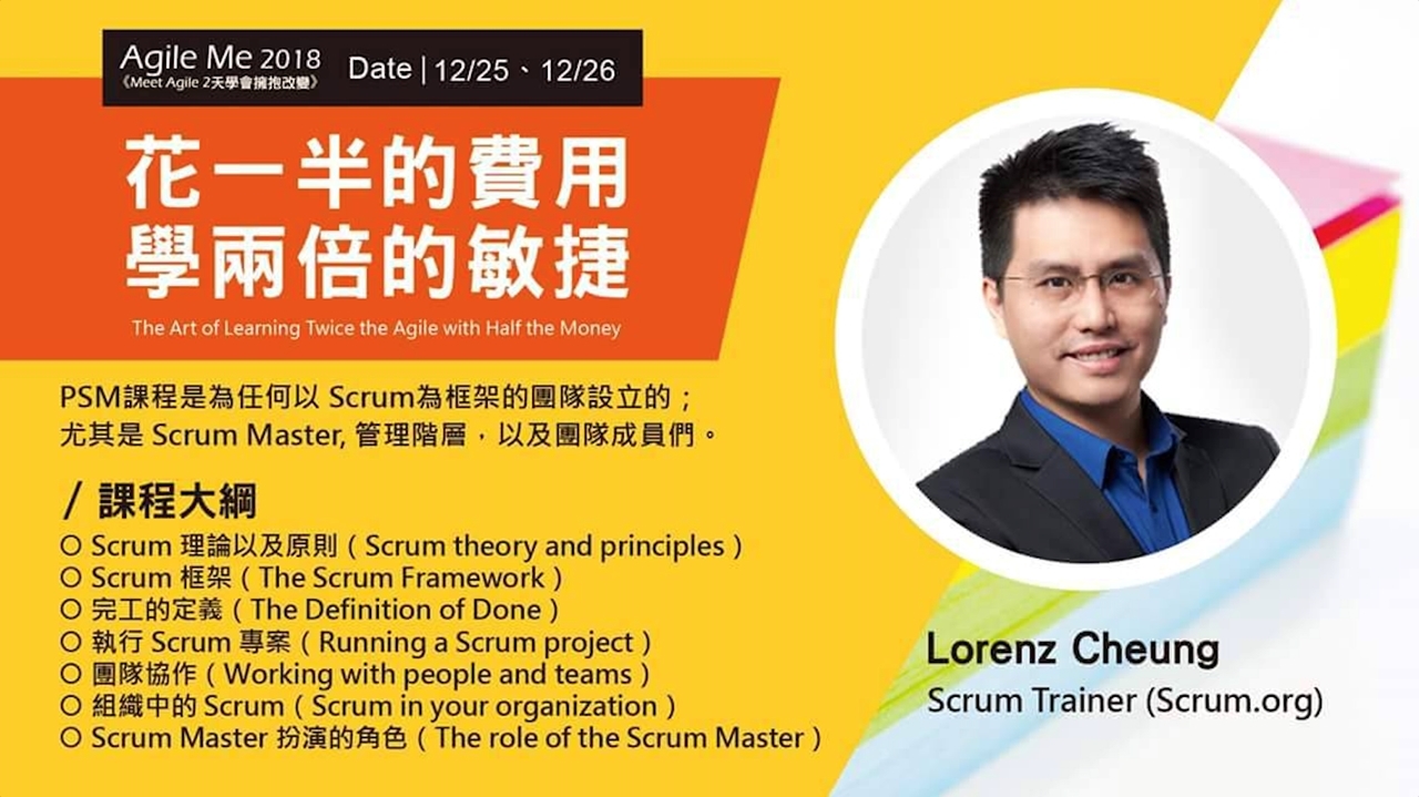 Scrum.org 與敏捷專家學會合作,共同推出 Professional Scrum Master 專業課程以及 Ailge Me 2018 年會套票組合,有需要的朋友們請直接連絡 hades.wang@hotamail.com 或電 0983221940 將有專人為您辦理。