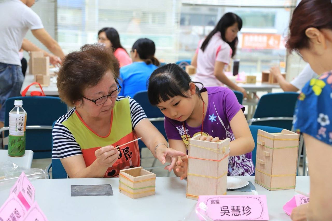 辦公室文具收納小物,上面可以當筆筒,下格有小抽屜,是以材料包的形式現場再解說示範組裝起來。組裝的過程可以再用線鋸加工,上膠後以橡皮筋綑綁固定,小木片裝飾外型,最後再上壓克力顏料作為木料保護。