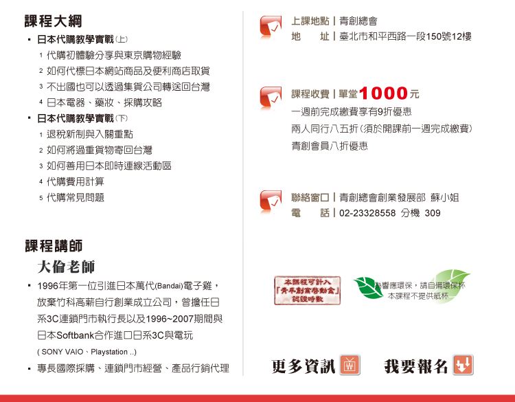 ☑ 單一課程超過1,000元以上,即贈送100元課程折價卷,可折抵下次青創學院課程費用