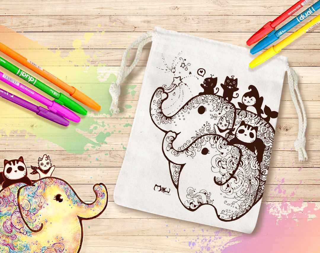 在大束口袋上,黑白輪廓線條中,填滿最豐富的色彩,讓大象與喵星人更快樂喔!