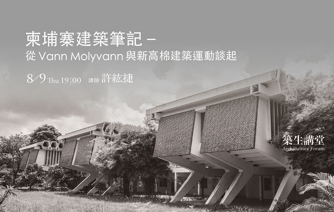 【築生講堂_建築旅行講座】08/09(四)19:00-21:30 柬埔寨建築筆記-從Vann Molyvann與新高棉建築運動談起講師_許紘捷 (Symbodia│柬式符號 擔任自雇者)你知道在紅高棉內戰之前,柬埔寨曾有過輝煌的現代建築時期嗎? 這場分享,將從神王時代的古高棉寺廟做為引子,到法國殖民時期的產物,再詳述獨立後的現代建築高峰——新高棉建築。