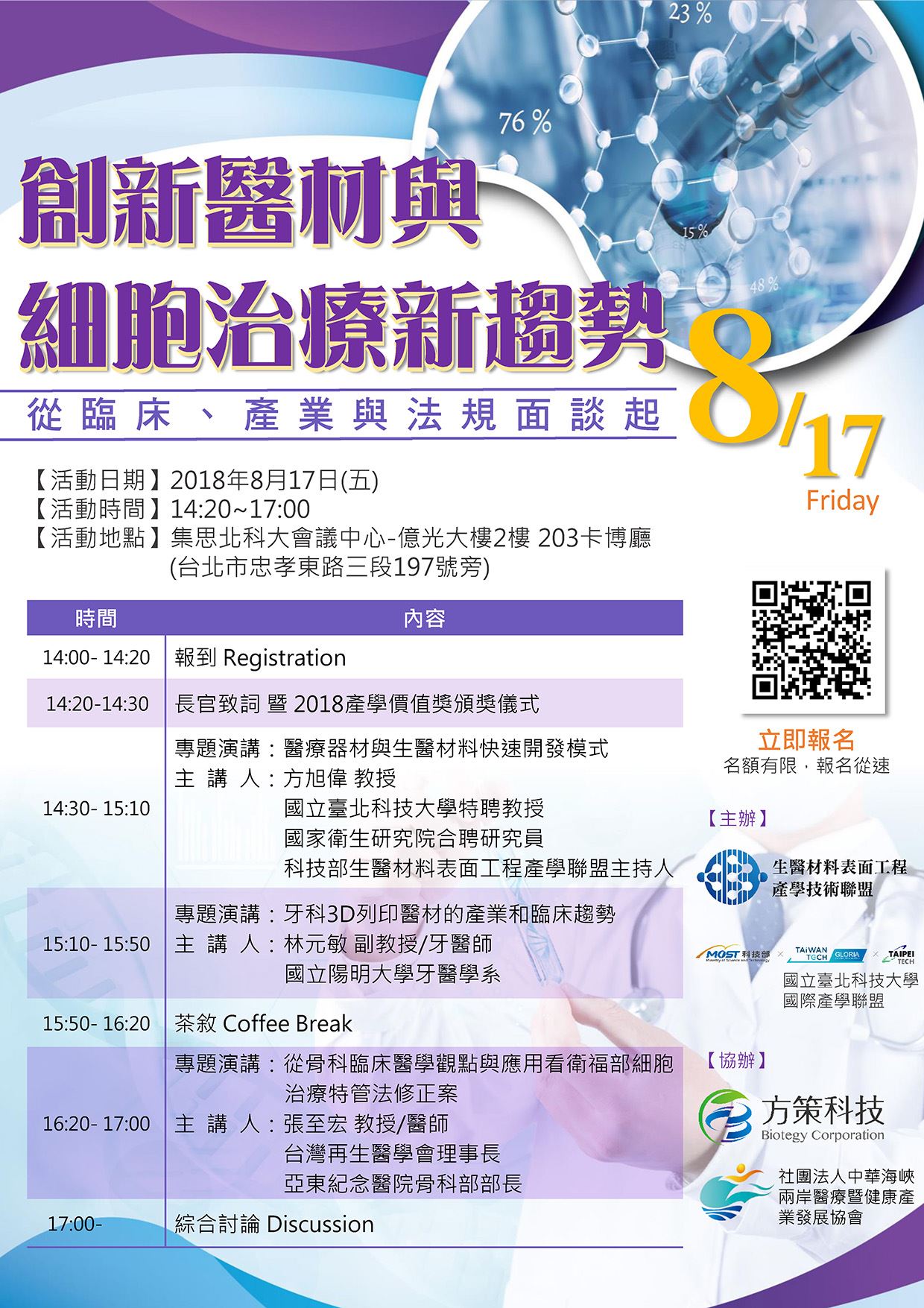 想要更加深入的了解生技醫療及細胞治療的奧秘嗎?快來與會討論並交流,在最短的時間內吸收醫材界各式各樣豐富資訊,快速獲得您想要的優質產品及技術!不論您有臨床需求與臨床應用策略、原型設計與加工製造還是開發醫材整合商品化的疑問等等......來參加此講座必能獲益良多 !