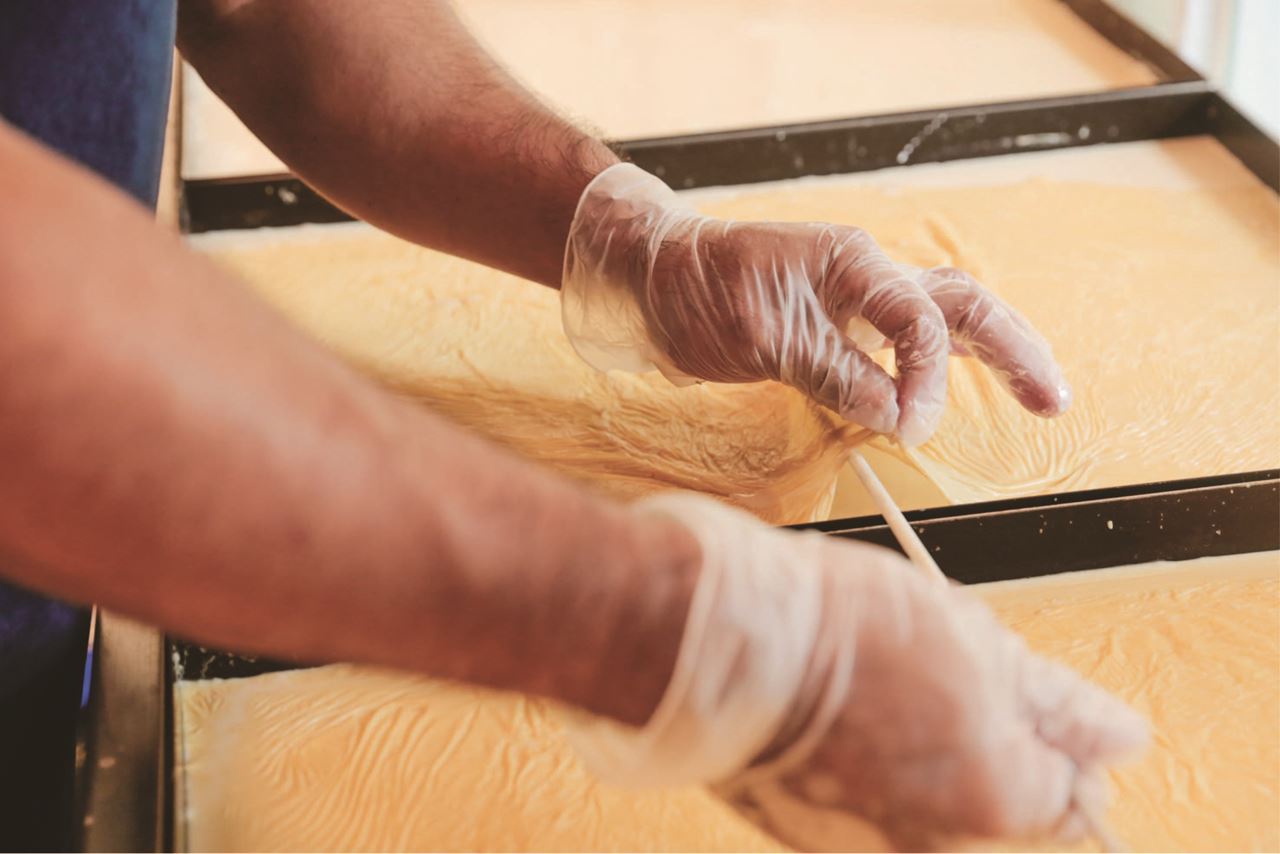 四十年多來老師傅堅持手工製麵,在熟練的甩麵節奏中,搭配一次次到位的甩勁,扎扎實實的力道,製作出口感適中的美味麵線。