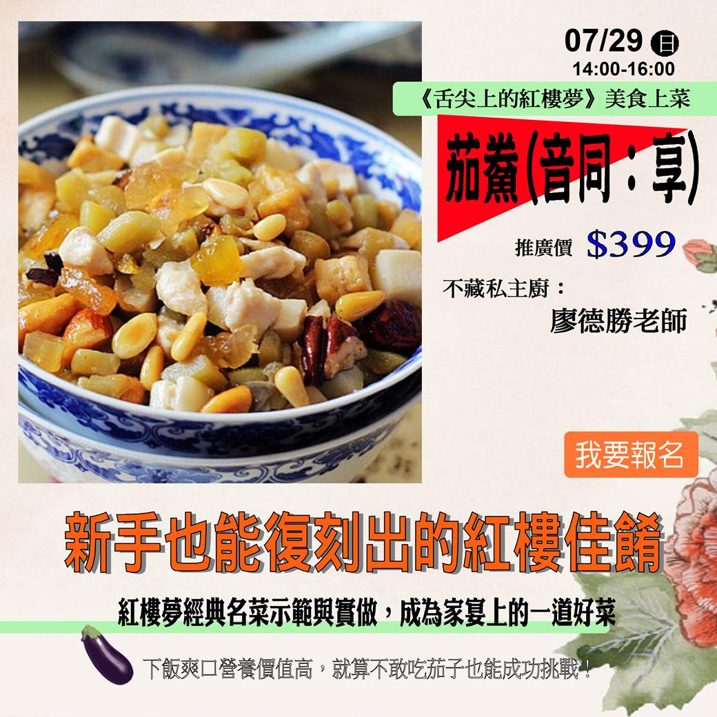 特地邀請熟闇大江南北中國菜大廚~廖德勝老師,現場帶您復刻紅樓美食,加一點巧思及小撇步,新手也能複製出紅樓佳餚,成為家宴上的一道好菜!