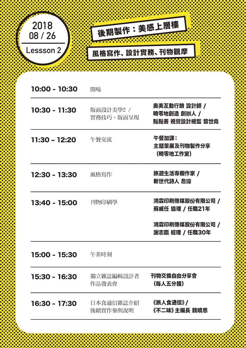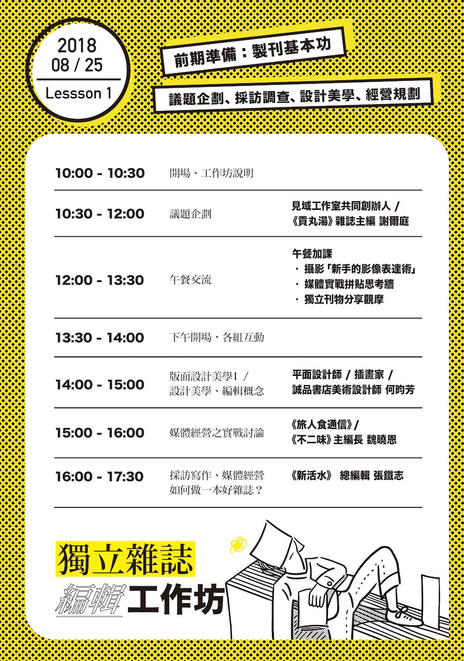 本次課程分為兩天(8/25-26),邀請獨立刊物主編、設計師、旅遊生活作家及印刷職人等...到場分享經驗、激盪火花。