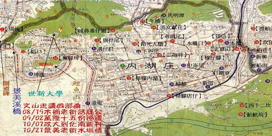 路線:木柵國小-文山公民會館/區政中心公園〈忠魂碑、畜魂碑〉-文山教會-更寮山-渡船頭福德宮-翁公埤與翁公圳-三芳油行/屠宰場舊址/木柵市場-瓦厝/木柵集應廟-木柵國中-公路局舊址。