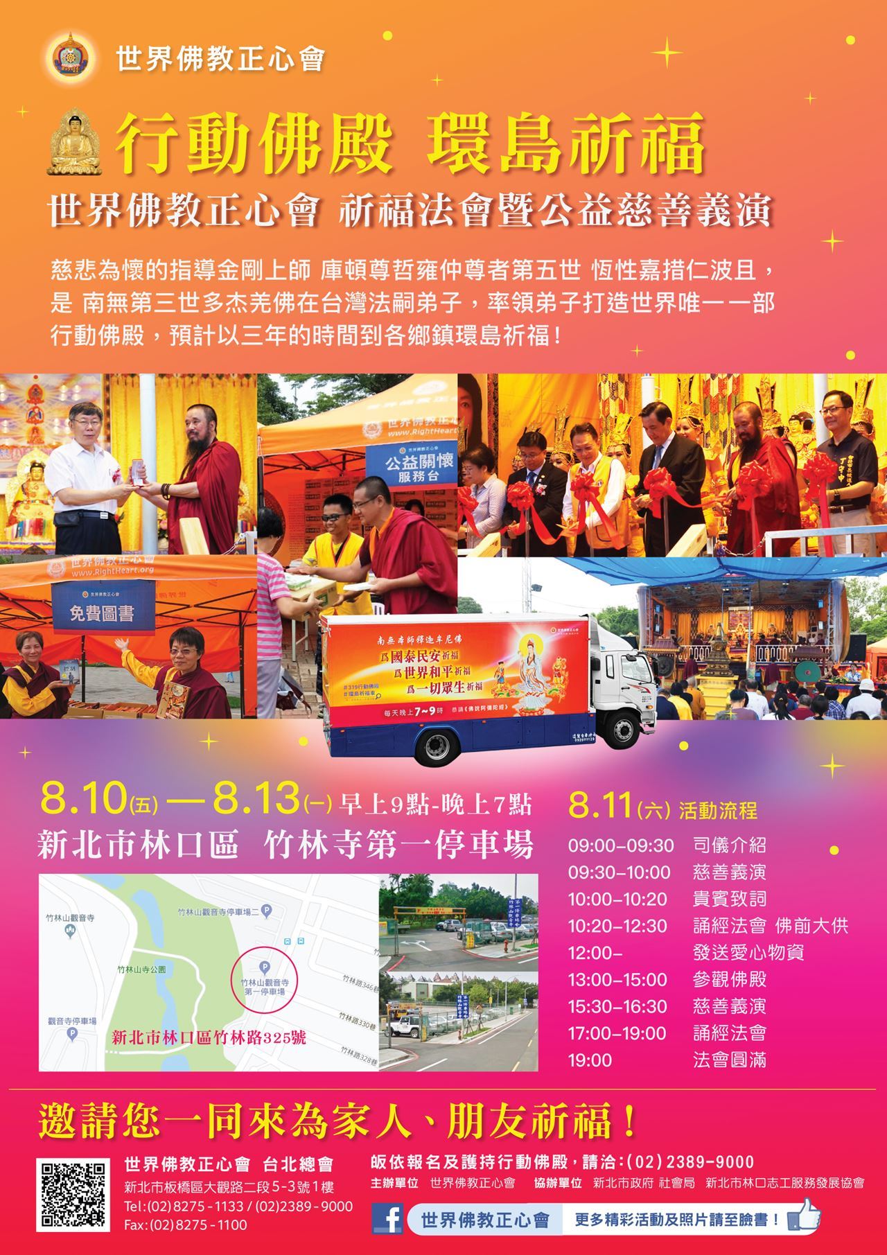 由於全球經濟不景氣影響國內民生發展,加上政局外交多有變動,乃至氣候變遷,人心動盪不安,本會指導金剛上師 庫頓尊哲雍仲尊者第五世 恆性嘉措仁波且帶領弟子打造「行動佛殿」,展開環島祈福之行。行動佛殿第八站-林口竹林寺第一停車場,即將在8月10日到8月13日盛大舉辦