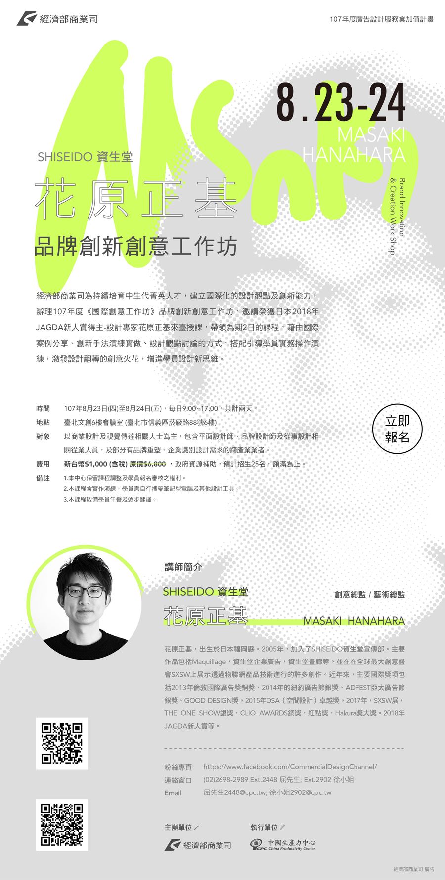 由經濟部商業司主辦,107年度廣告設計服務業加值計畫-第一場國際創意工作坊,邀請今年榮獲日本JAGDA新人賞的花原正基先生,任職於資生堂擔任藝術總監,負責資生堂企業品牌廣告及設計,兩天的實戰工作坊將以解構探索百年蛻變的資生堂美學,以及迎合新時代數位創新體驗的品牌設計戰略進行分享~一步步帶領學員,創新商業思維,翻轉品牌設計,